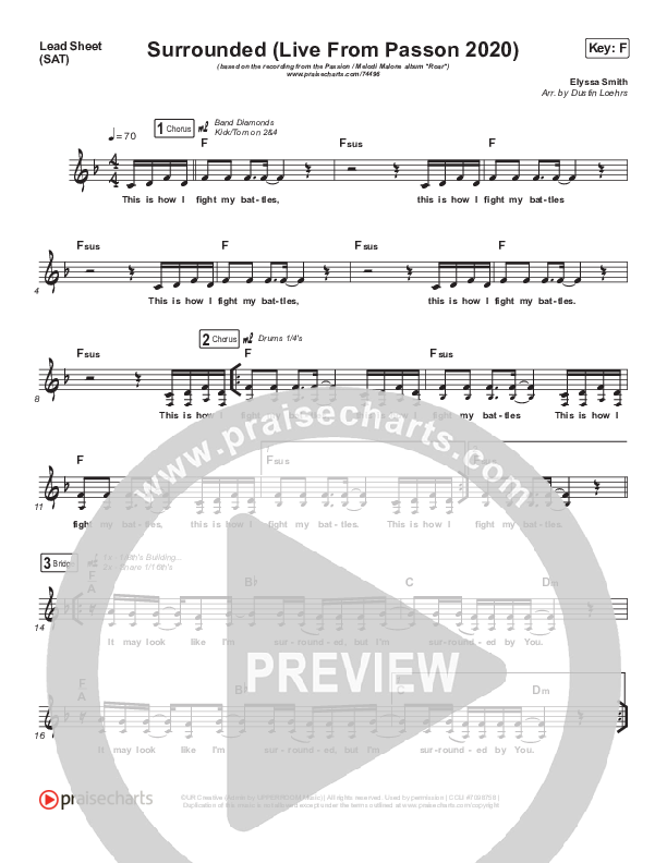 Download the sheet music for Surrounded (Fight My Battles) (Live From Passion 2020) by Passion / Melodie Malone, from the album Roar (Live From Passion 2020). This song was arranged by Dustin Loehrs in the key of F, G.