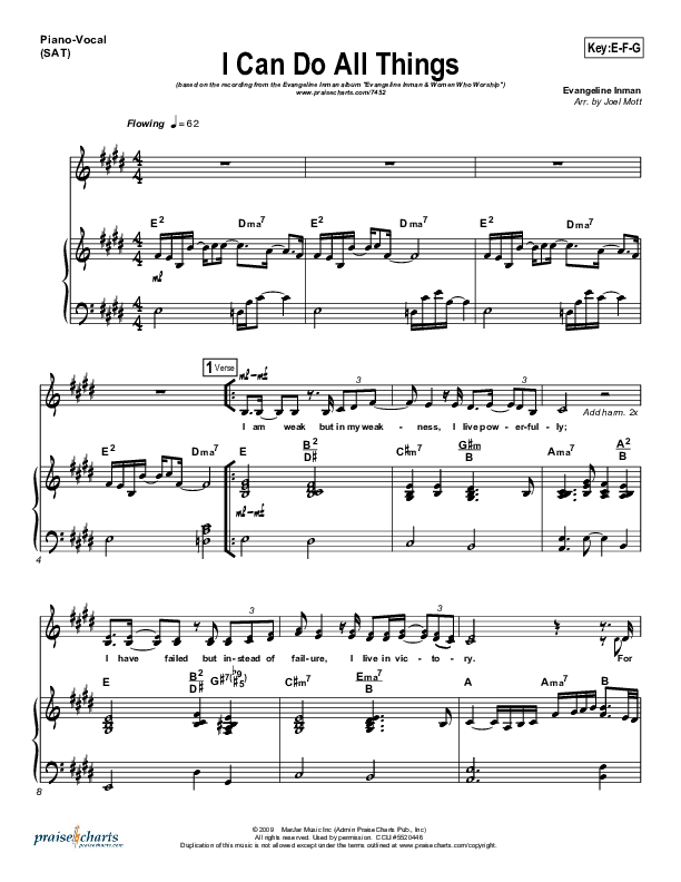 Download the sheet music for I Can Do All Things by Evangeline Inman, from the album Evangeline Inman & Women Who Worship. This song was arranged by Joel Mott in the key of E, Eb.