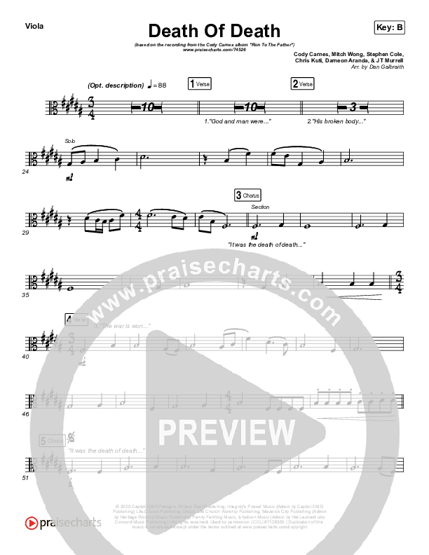 Download the Viola sheet music for Death Of Death by Cody Carnes, from the album Run To The Father. This song was arranged by Daniel Galbraith in the key of B, Bb.