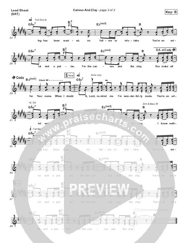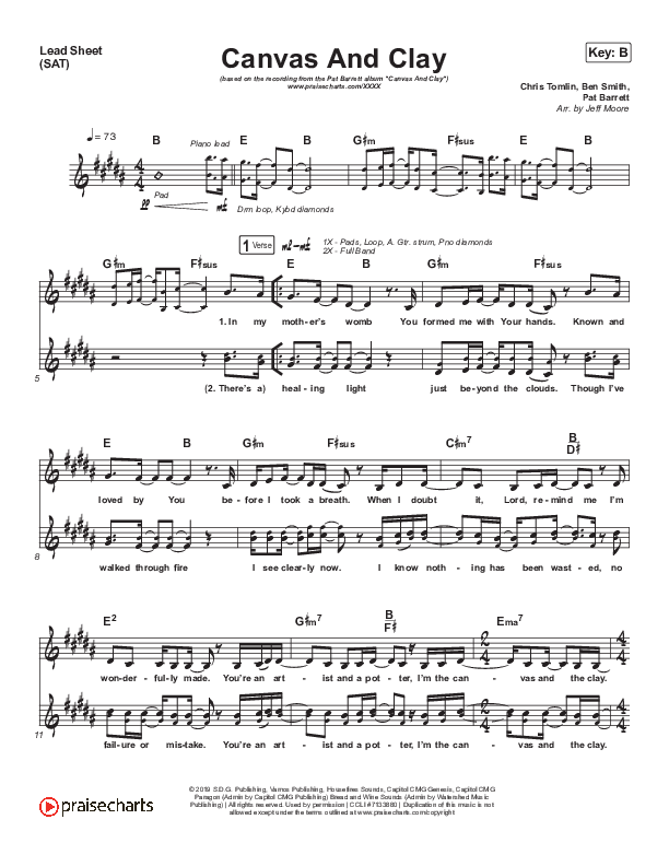 Download the sheet music for Canvas And Clay (Studio) by Pat Barrett, from the album Act Justly Love Mercy Walk Humbly. This song was arranged by Jeff Moore in the key of B, Bb.