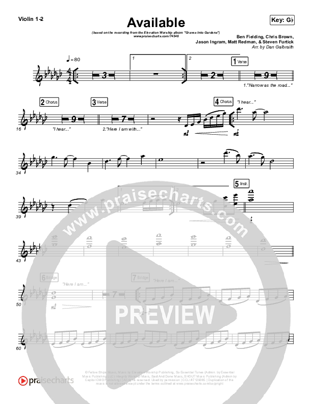Download the Violin sheet music for Available by Elevation Worship, from the album Graves Into Gardens. This song was arranged by Daniel Galbraith in the key of G, Gb.