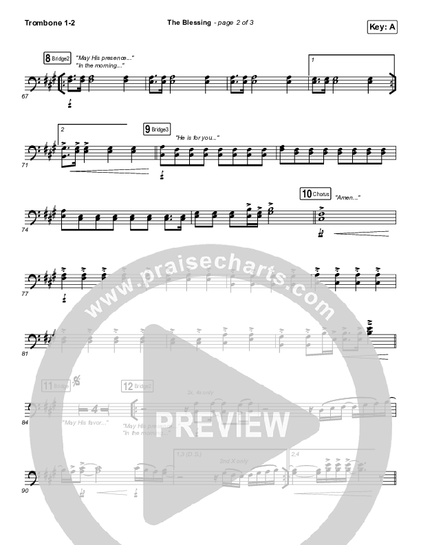 Download the Trombone sheet music for The Blessing (Live) by Elevation Worship / Kari Jobe / Cody Carnes, from the album Graves Into Gardens. This song was arranged by Daniel Galbraith in the key of A, B, Bb, C.