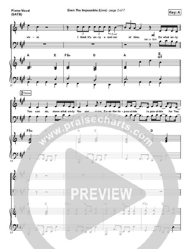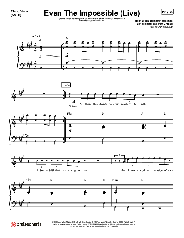 Download the sheet music for Even The Impossible (Live) by Mack Brock, from the album Space. This song was arranged by Daniel Galbraith in the key of A, Ab.