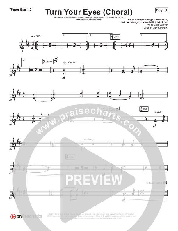 Download the Tenor Sax sheet music for Turn Your Eyes (Choral Anthem SATB) by Sovereign Grace / Arr. Luke Gambill, from the album The Glorious Christ. This song was arranged by Luke Gambill / Daniel Galbraith in the key of C.