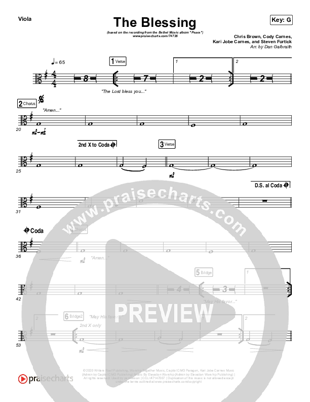 Download the Viola sheet music for The Blessing by Bethel Music / We The Kingdom, from the album Peace. This song was arranged by Daniel Galbraith in the key of Ab, G.