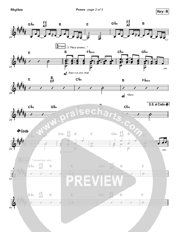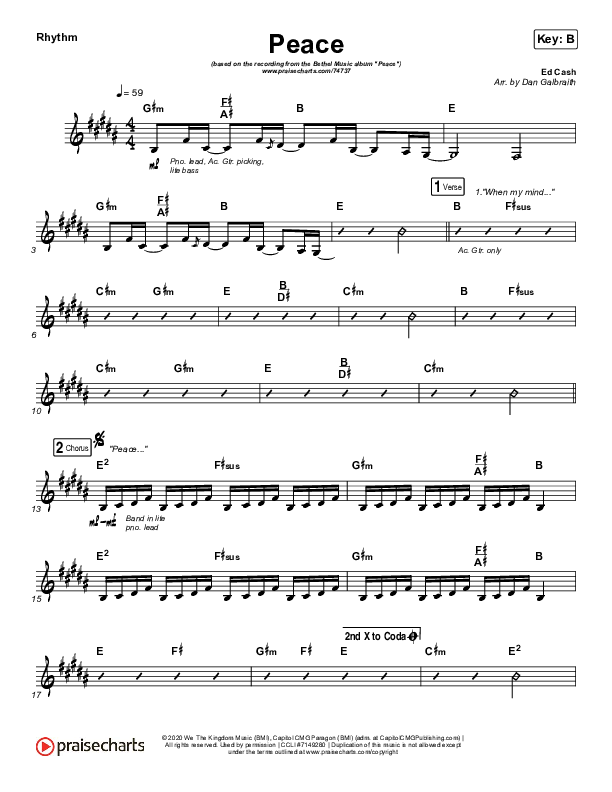 Download the Rhythm Chart for Peace by Bethel Music / We The Kingdom, from the album Peace. This song was arranged by Daniel Galbraith in the key of B, C.