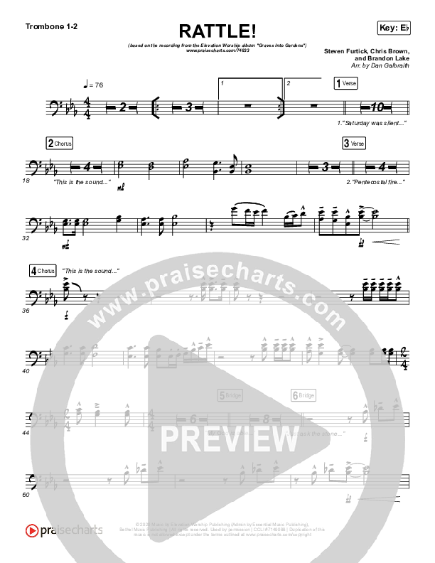 Download the Trombone 1,2 sheet music for RATTLE! by Elevation Worship, from the album Graves Into Gardens. This song was arranged by Daniel Galbraith in the key of Bb, D, Eb.