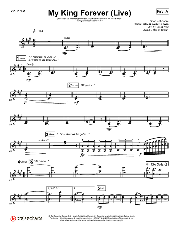 Download the Orchestration string parts for My King Forever (Live) by Josh Baldwin, from the album Homecoming. This song was arranged by Grant Wall / Mason Brown in the key of A, Ab, G.