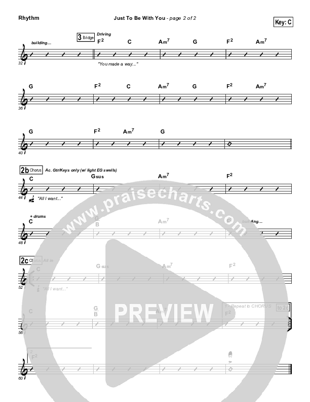 Download the Rhythm Chart for Just To Be With You by Paul Baloche, from the album Glorious. This song was arranged by Frank Ralls in the key of C, D.