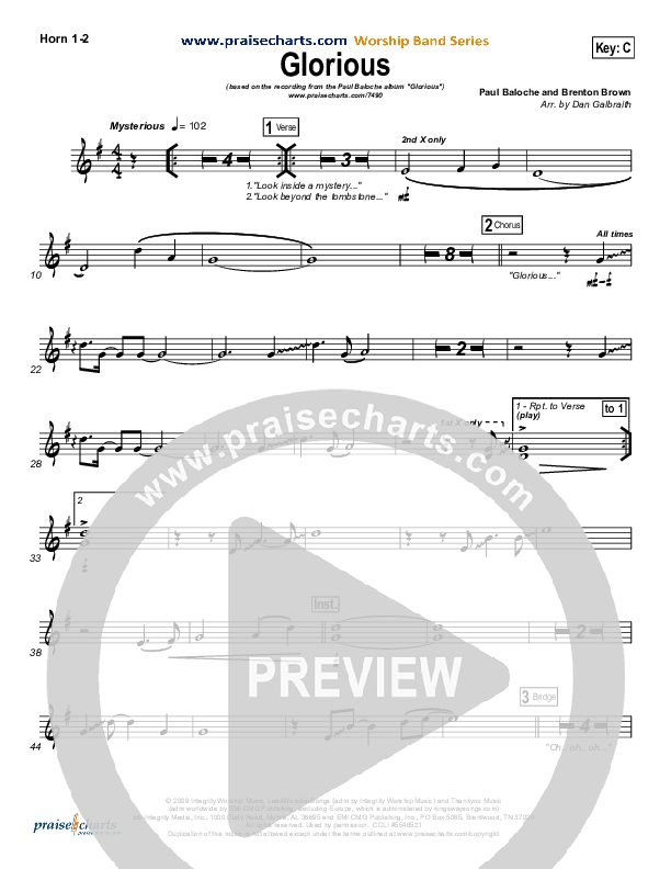 Download the Orchestration brass parts for Glorious by Paul Baloche, from the album Glorious. This song was arranged by Daniel Galbraith in the key of Bb, C.