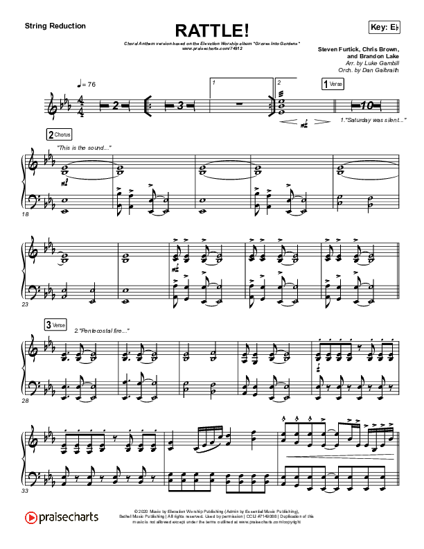 Download the String Reduction sheet music for RATTLE! (Choral Anthem SATB) by Elevation Worship / Arr. Luke Gambill, from the album Graves Into Gardens. This song was arranged by Luke Gambill / Daniel Galbraith in the key of Eb.