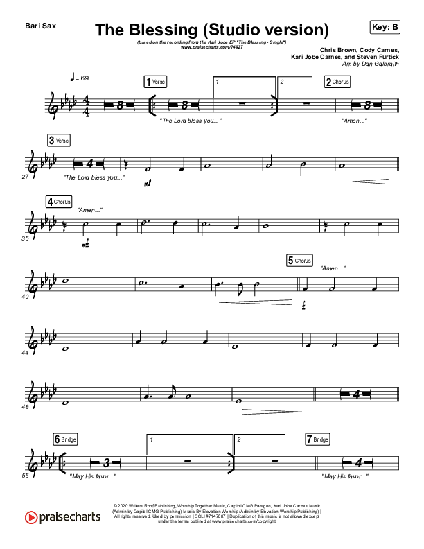 Download the Bari Sax sheet music for The Blessing (Studio) by Kari Jobe / Cody Carnes, from the album The Blessing - Single. This song was arranged by Daniel Galbraith in the key of B, Bb.