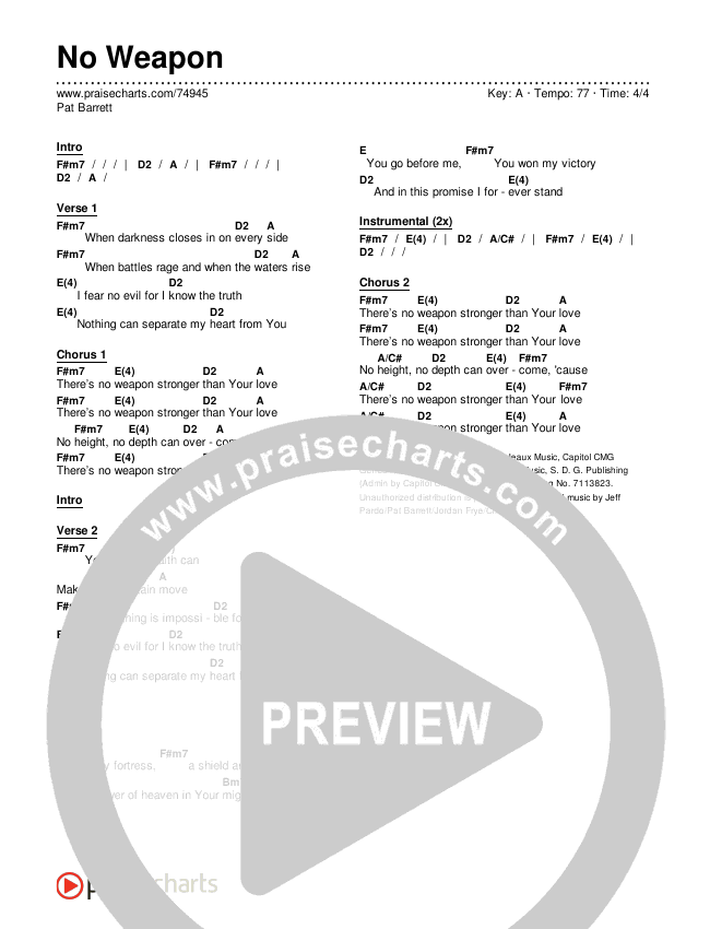 Download the PDF Chord Charts for No Weapon by Pat Barrett, from the album Act Justly Love Mercy Walk Humbly. This song was arranged by Grant Wall in the key of A, Ab.