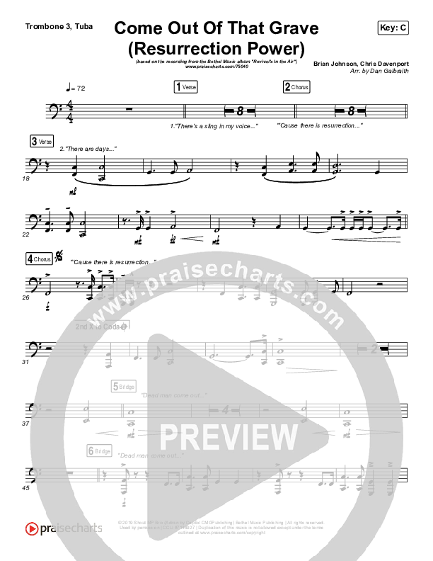 Download the Trombone 3/Tuba sheet music for Come Out Of That Grave (Resurrection Power) (Live) by Bethel Music / Brandon Lake, from the album Revival's In The Air. This song was arranged by Daniel Galbraith in the key of Bb, C.