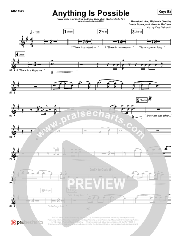 Download the AltoSax sheet music for Anything Is Possible (Live) by Bethel Music / Dante Bowe, from the album Revival's In The Air. This song was arranged by Daniel Galbraith in the key of Bb, C.