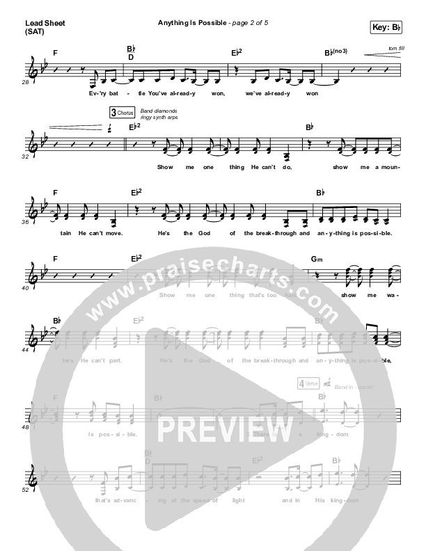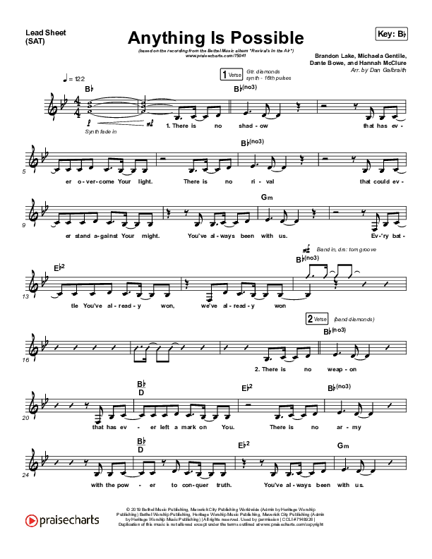 Download the sheet music for Anything Is Possible (Live) by Bethel Music / Dante Bowe, from the album Revival's In The Air. This song was arranged by Daniel Galbraith in the key of Bb, C.