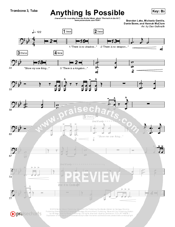 Download the Trombone 3/Tuba sheet music for Anything Is Possible (Live) by Bethel Music / Dante Bowe, from the album Revival's In The Air. This song was arranged by Daniel Galbraith in the key of Bb, C.