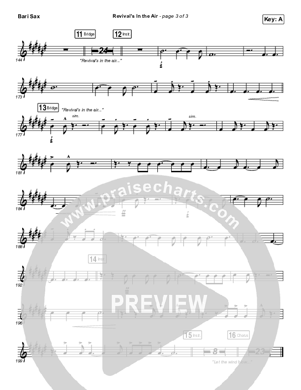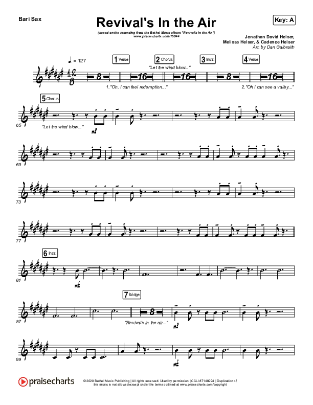 Download the Bari Sax sheet music for Revival's In The Air (Live) by Bethel Music / Melissa Helser, from the album Revival's In The Air. This song was arranged by Daniel Galbraith in the key of A, Bb.