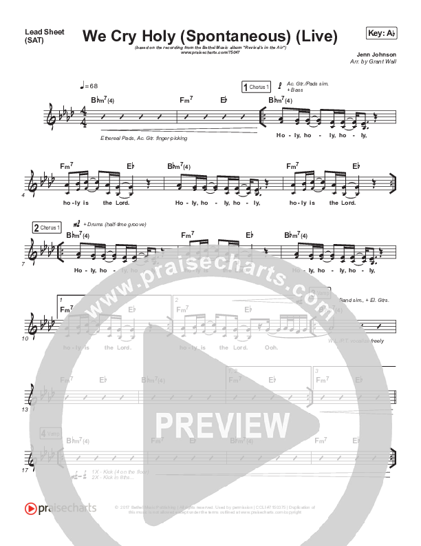 Download the sheet music for We Cry Holy (Spontaneous) (Live) by Bethel Music / Jenn Johnson, from the album Revival's In The Air. This song was arranged by Grant Wall in the key of Ab, G.