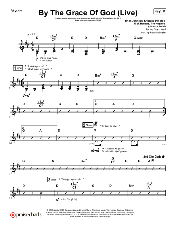 Download the Rhythm Chart for By The Grace Of God (Live) by Bethel Music / Brian Johnson / Jenn Johnson, from the album Revival's In The Air. This song was arranged by Grant Wall / Daniel Galbraith in the key of D, Eb.