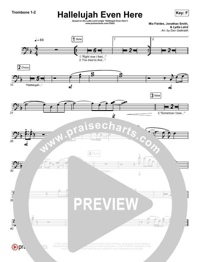 Download the Orchestration brass parts for Hallelujah Even Here by Lydia Laird, from the album Hallelujah Even Here. This song was arranged by Daniel Galbraith in the key of F, G.