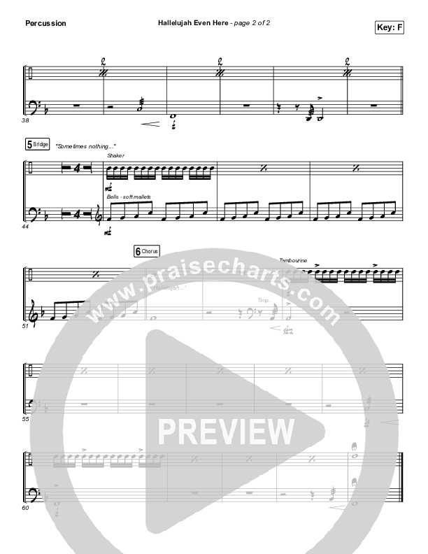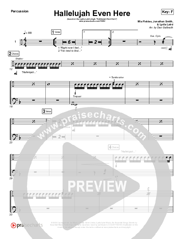 Download the percussion sheet music for Hallelujah Even Here by Lydia Laird, from the album Hallelujah Even Here. This song was arranged by Daniel Galbraith in the key of F, G.