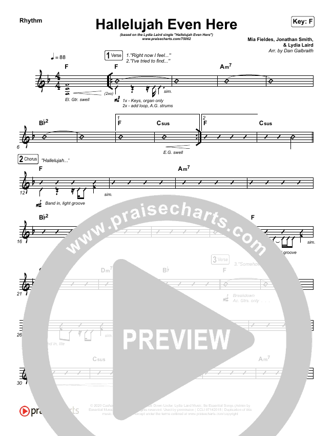 Download the Rhythm Chart for Hallelujah Even Here by Lydia Laird, from the album Hallelujah Even Here. This song was arranged by Daniel Galbraith in the key of F, G.