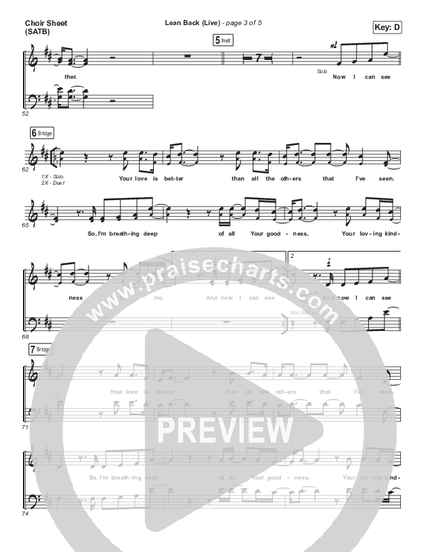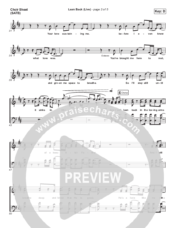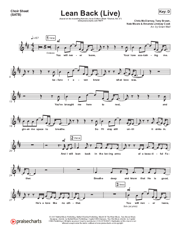 Download the Choir Sheet for Lean Back (Live) by Jesus Culture / Chris McClarney / Katie Torwalt, from the album Church Volume Two. This song was arranged by Grant Wall in the key of D, Db.