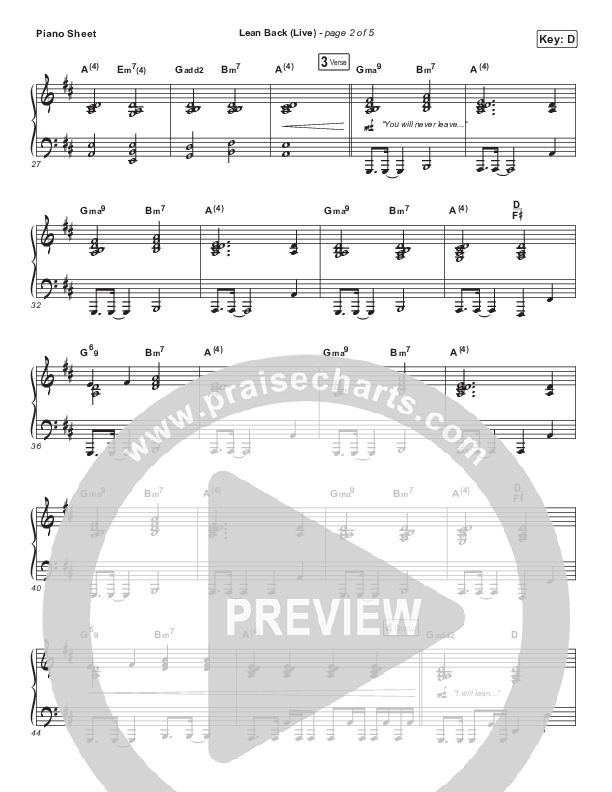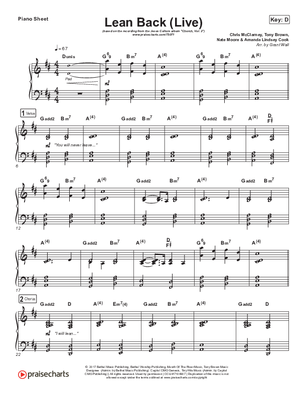 Download the piano sheet for Lean Back (Live) by Jesus Culture / Chris McClarney / Katie Torwalt, from the album Church Volume Two. This song was arranged by Grant Wall in the key of D, Db.