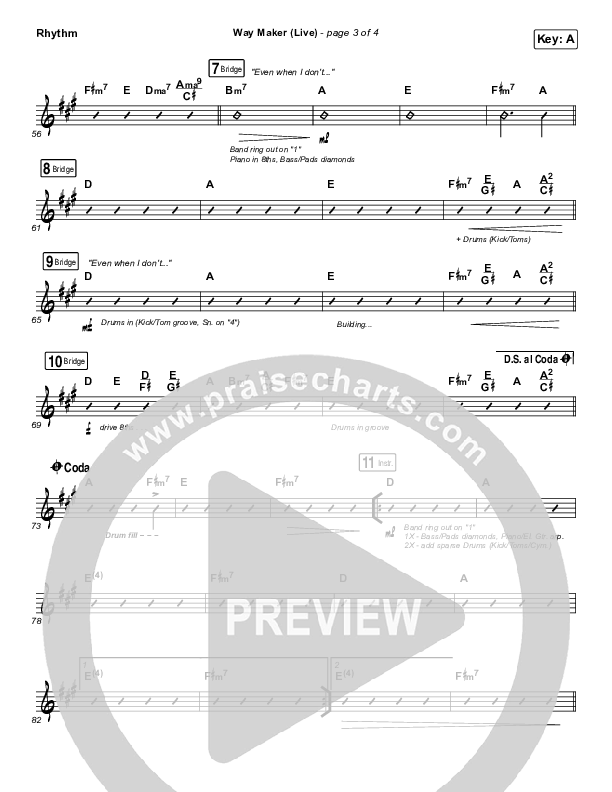 Download the Rhythm Chart for Way Maker (Live) by Sounds Of Unity / Darlene Zschech / William McDowell / REVERE, from the album Way Maker. This song was arranged by Grant Wall / Daniel Galbraith in the key of A, Ab.