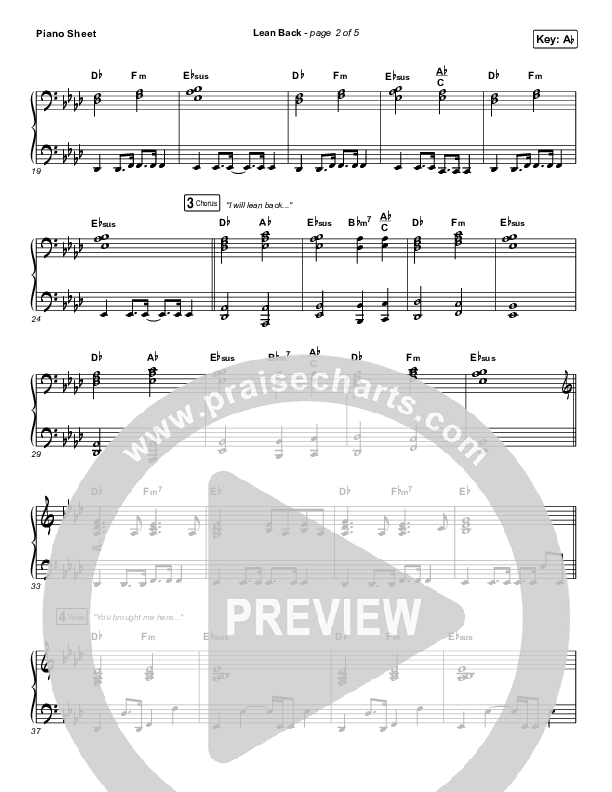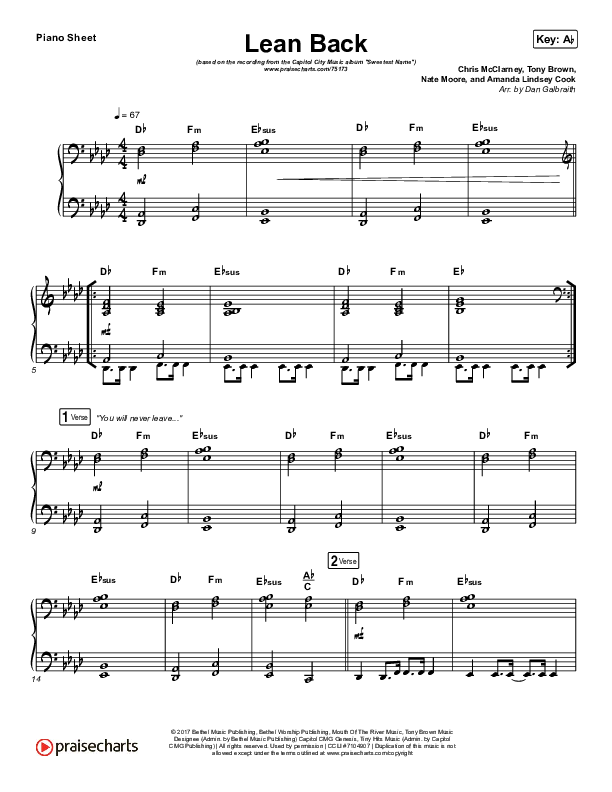 Download the piano sheet for Lean Back by Capital City Music, from the album Sweetest Name. This song was arranged by Daniel Galbraith in the key of Ab, G.