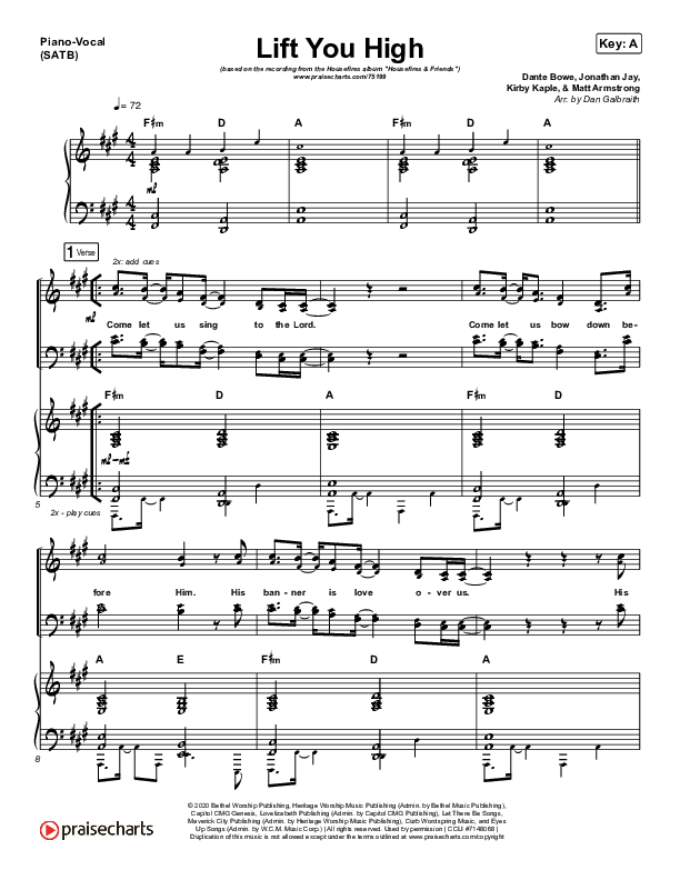 Download the sheet music for Lift You High by Housefires / Nate Moore / Katie Torwalt, from the album Housefires & Friends. This song was arranged by Daniel Galbraith in the key of A, Ab.
