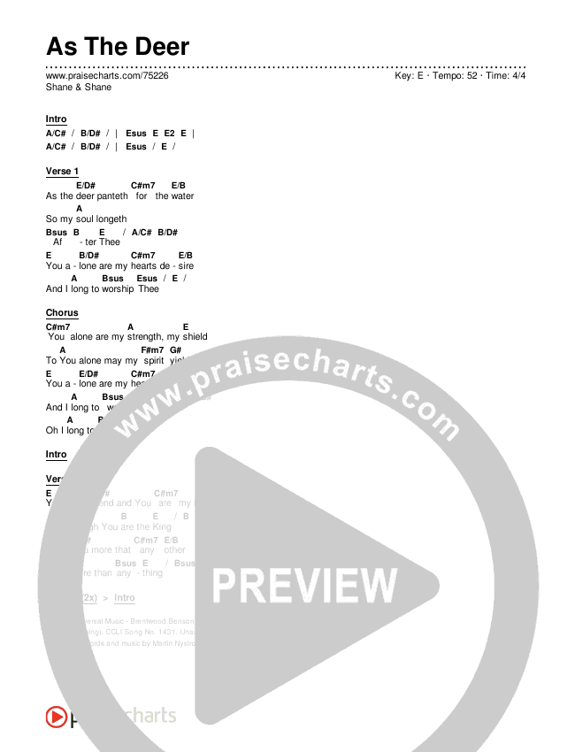 Download the PDF Chord Charts for As The Deer by Shane & Shane, from the album Vintage. This song was arranged by Daniel Galbraith in the key of E, Eb.