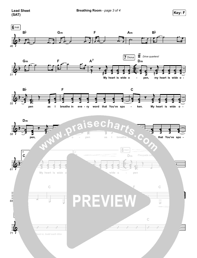 Download the sheet music for Breathing Room (Live) by Kim Walker-Smith, from the album Wild Heart. This song was arranged by Daniel Galbraith in the key of F, G.