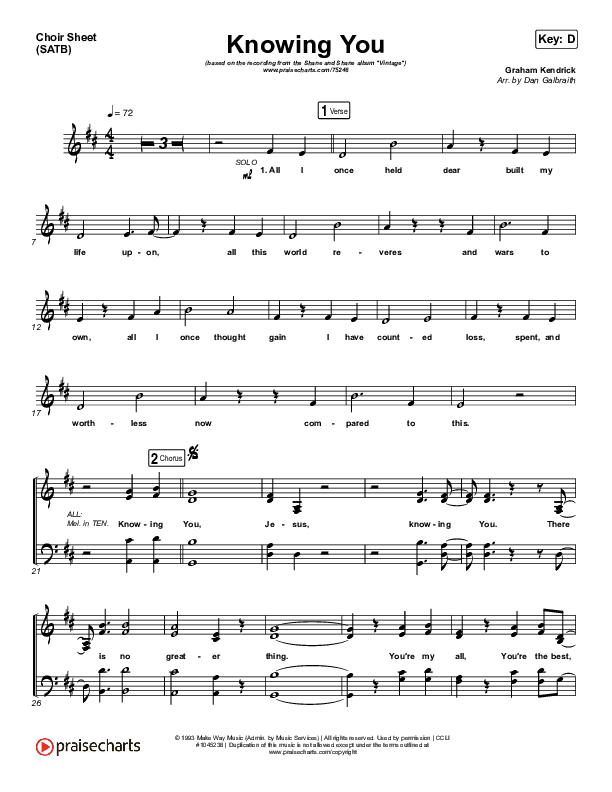 Download the Choir Sheet for Knowing You by Shane & Shane, from the album Vintage. This song was arranged by Daniel Galbraith in the key of C, D.
