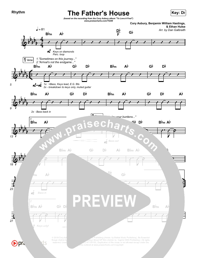 Download the Rhythm Chart for The Father's House by Cory Asbury, from the album To Love A Fool. This song was arranged by Daniel Galbraith in the key of C, Db.