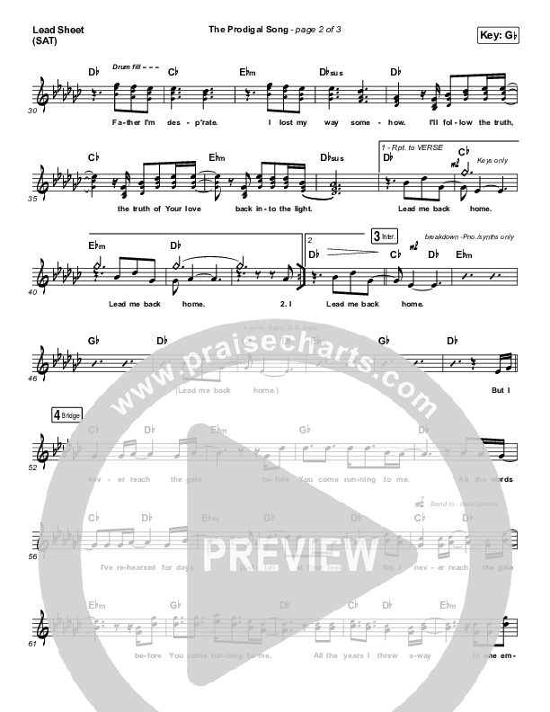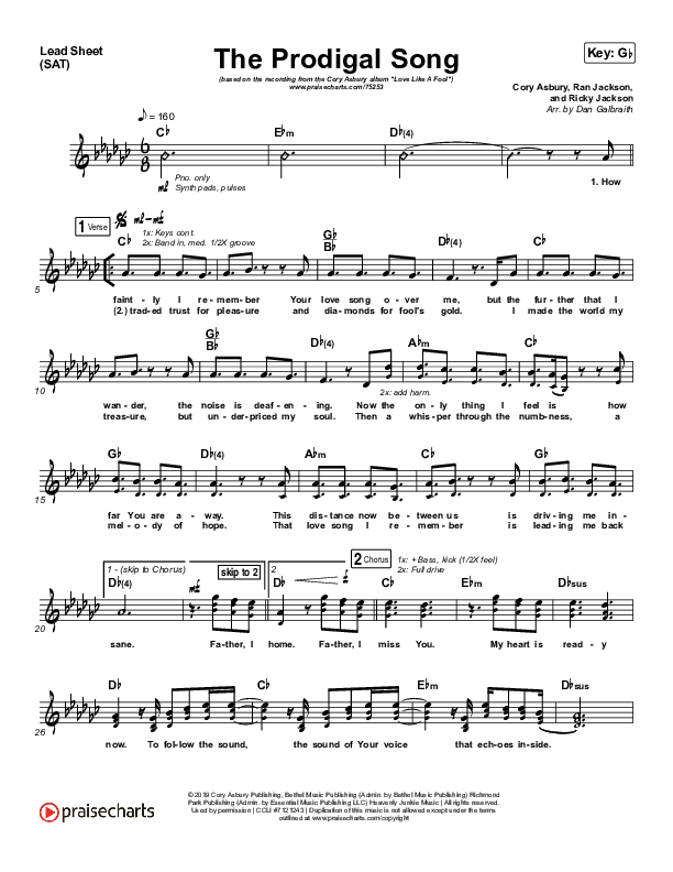 Download the sheet music for The Prodigal Song by Cory Asbury, from the album To Love A Fool. This song was arranged by Daniel Galbraith in the key of F, Gb.