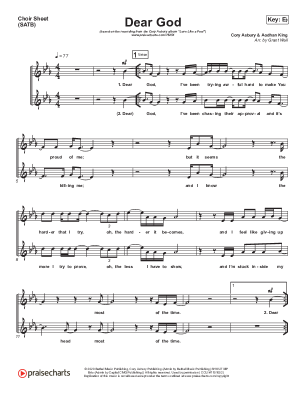 Download the Choir Sheet for Dear God by Cory Asbury, from the album To Love A Fool. This song was arranged by Grant Wall in the key of D, Eb.