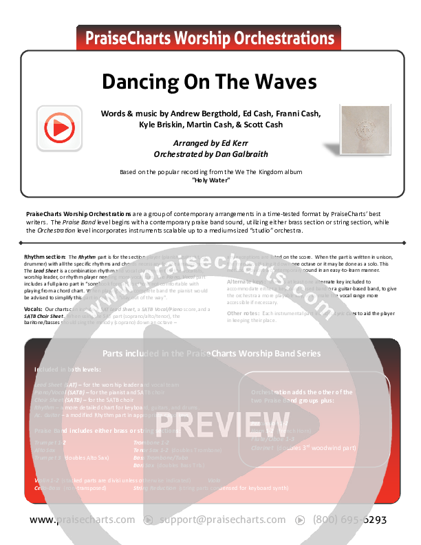 Download the Orchestration for Dancing On The Waves by We The Kingdom, from the album Holy Water. This song was arranged by Ed Kerr / Daniel Galbraith in the key of E, Eb.