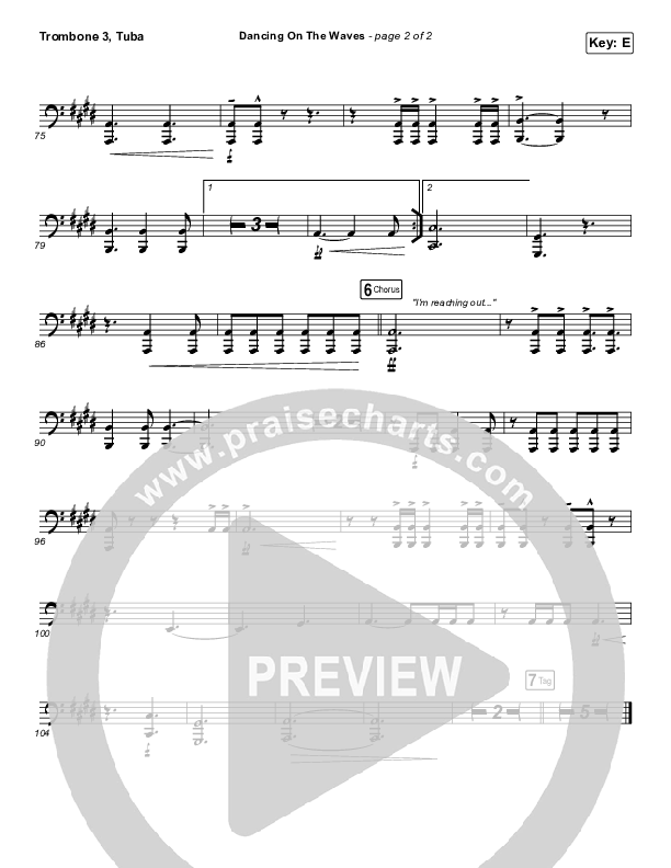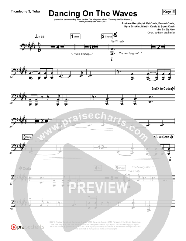 Download the Trombone 3/Tuba sheet music for Dancing On The Waves by We The Kingdom, from the album Holy Water. This song was arranged by Ed Kerr / Daniel Galbraith in the key of E, Eb.