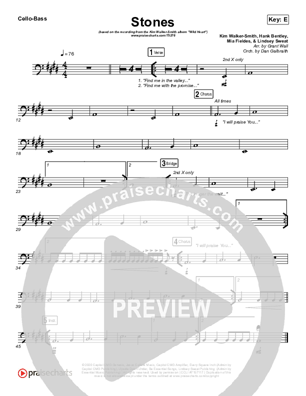 Download the Orchestration for Stones by Kim Walker-Smith, from the album Wild Heart. This song was arranged by Grant Wall / Daniel Galbraith in the key of E, F.