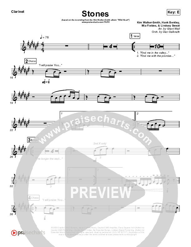 Download the Orchestration for Stones by Kim Walker-Smith, from the album Wild Heart. This song was arranged by Grant Wall / Daniel Galbraith in the key of E, F.