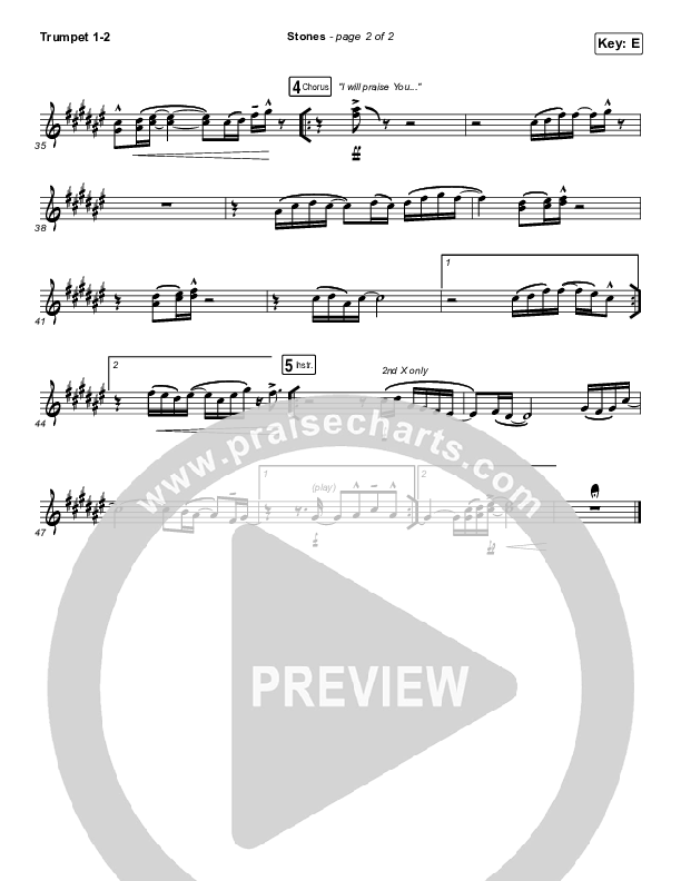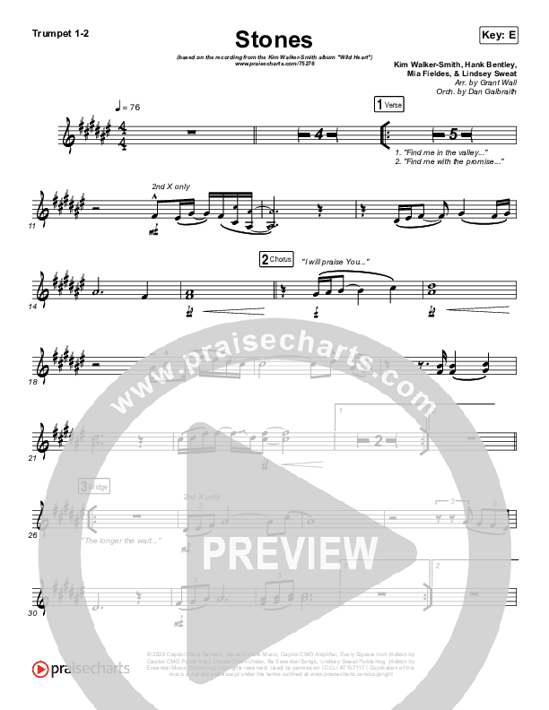 Download the trumpet sheet music for Stones by Kim Walker-Smith, from the album Wild Heart. This song was arranged by Grant Wall / Daniel Galbraith in the key of E, F.