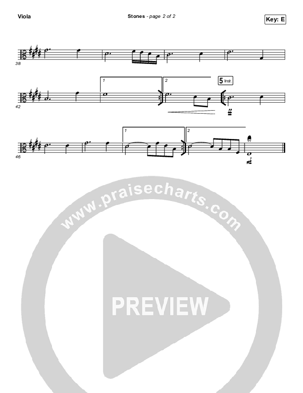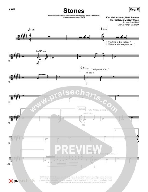 Download the Viola sheet music for Stones by Kim Walker-Smith, from the album Wild Heart. This song was arranged by Grant Wall / Daniel Galbraith in the key of E, F.