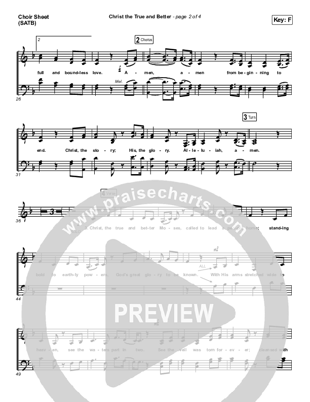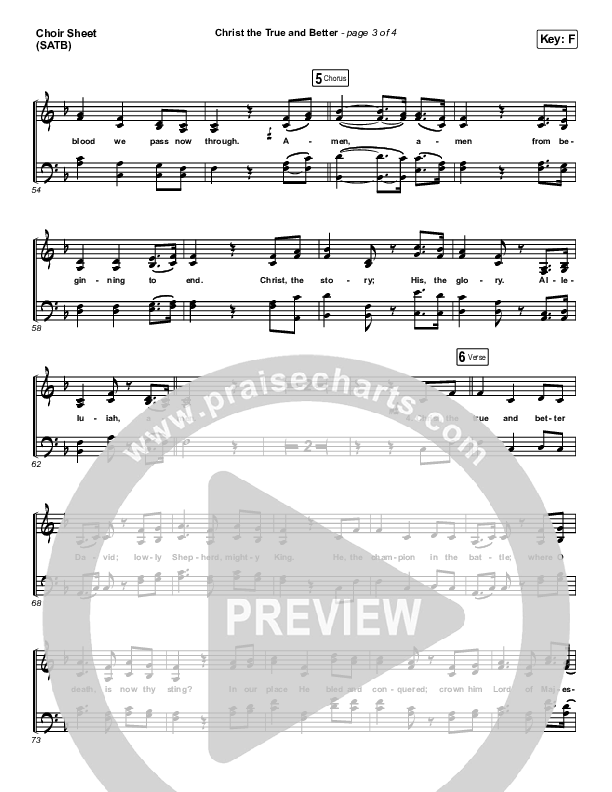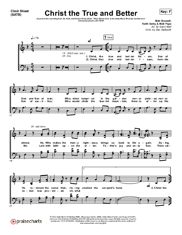Download the Choir Sheet for Christ The True And Better by Keith & Kristyn Getty / Matt Boswell / Matt Papa, from the album Sing! Global - Live At The Getty Music Worship Conference. This song was arranged by Grant Wall / Daniel Galbraith in the key of F, G.