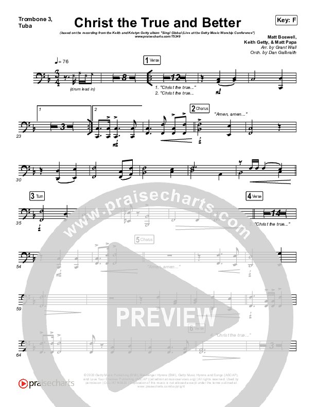 Download the Trombone sheet music for Christ The True And Better by Keith & Kristyn Getty / Matt Boswell / Matt Papa, from the album Sing! Global - Live At The Getty Music Worship Conference. This song was arranged by Grant Wall / Daniel Galbraith in the key of F, G.