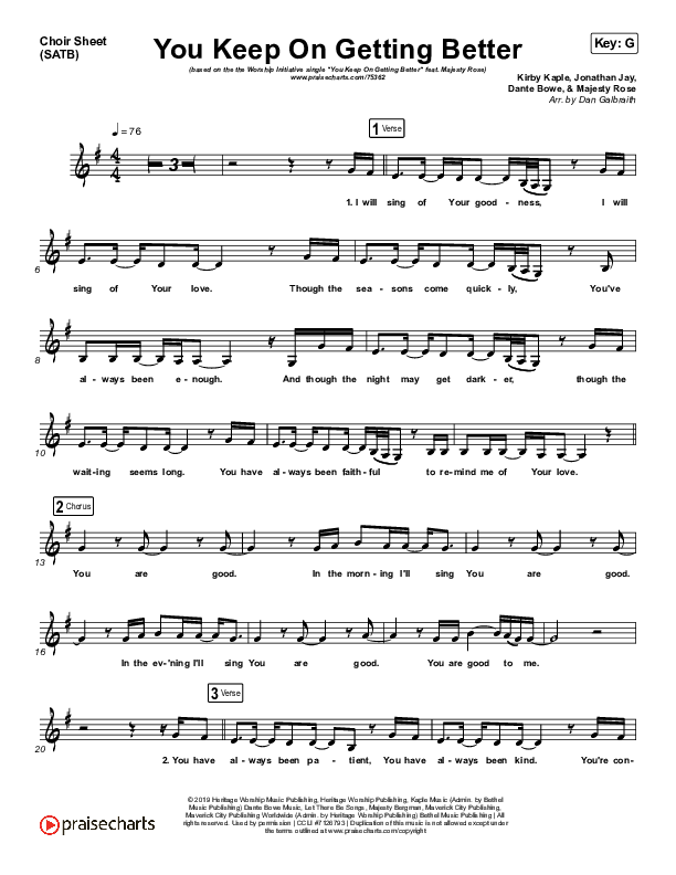 Download the Choir Sheet for You Keep On Getting Better by The Worship Initiative / Shane & Shane / Majesty Rose, from the album The Worship Initiative Volume 22. This song was arranged by Daniel Galbraith in the key of Ab, G.
