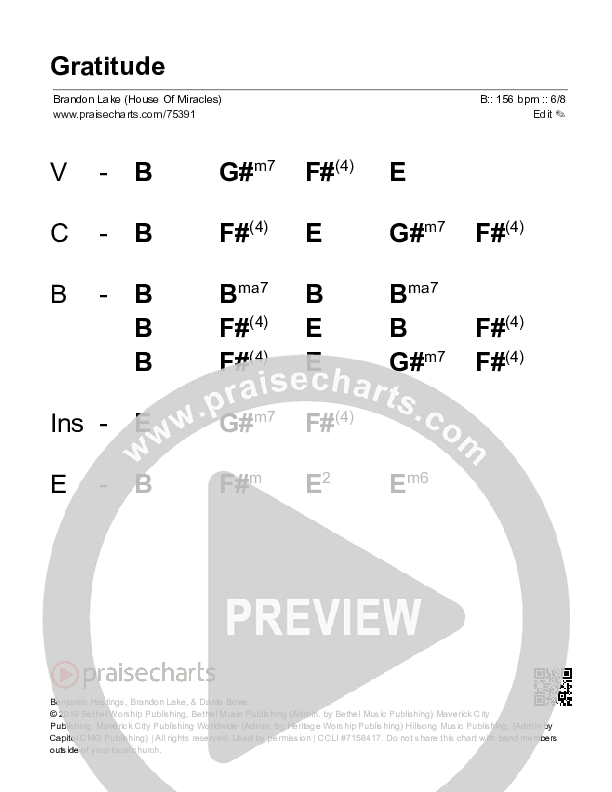 Download the free PDF Chord Charts for Gratitude by Brandon Lake, from the album House Of Miracles. This song was arranged by Daniel Galbraith in the key of A, B, Bb, E.