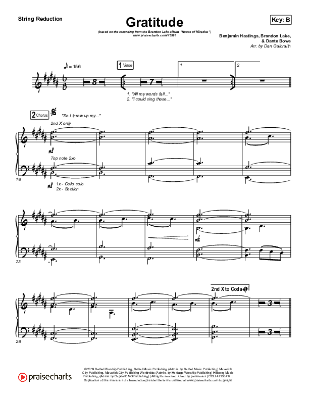 Download the Orchestration for Gratitude by Brandon Lake, from the album House Of Miracles. This song was arranged by Daniel Galbraith in the key of A, B, Bb, E.