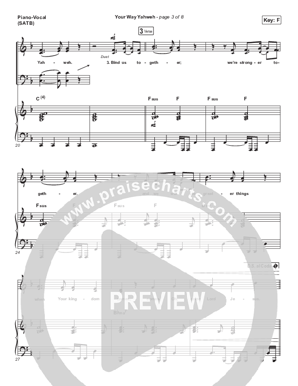 Download the sheet music for Your Way Yahweh by Jeremy Camp / Adrienne Camp, from the album The Worship Project. This song was arranged by Grant Wall in the key of E, F.